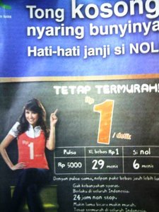 - Hati Hati Janji Si Nol. Dari pernyataan ini terlihat siapa “rival” dari iklan ini. Figur wanita yang sedang duduk di atas tong sampah yang terbuka menunjukkan superioritas yaitu berusaha menunjukkan bahwa saya (kartu XL) menang dari (kartu Mentari). Gambar tong sampah yang penutupnya bertuliskan Rp 0 hanya utk 3 mnt tanda semiotik mengacu pada kegiatan merendahkan ”Rival” dari iklan ini yaitu iklan pada gambar iklan nomor 1. Dengan melihat tanda semiotik ini, seakan-akan memberi informasi pada kita bahwa menurut Iklan 2, iklan 1 layak untuk dimasukkan ke dalam tong sampah.